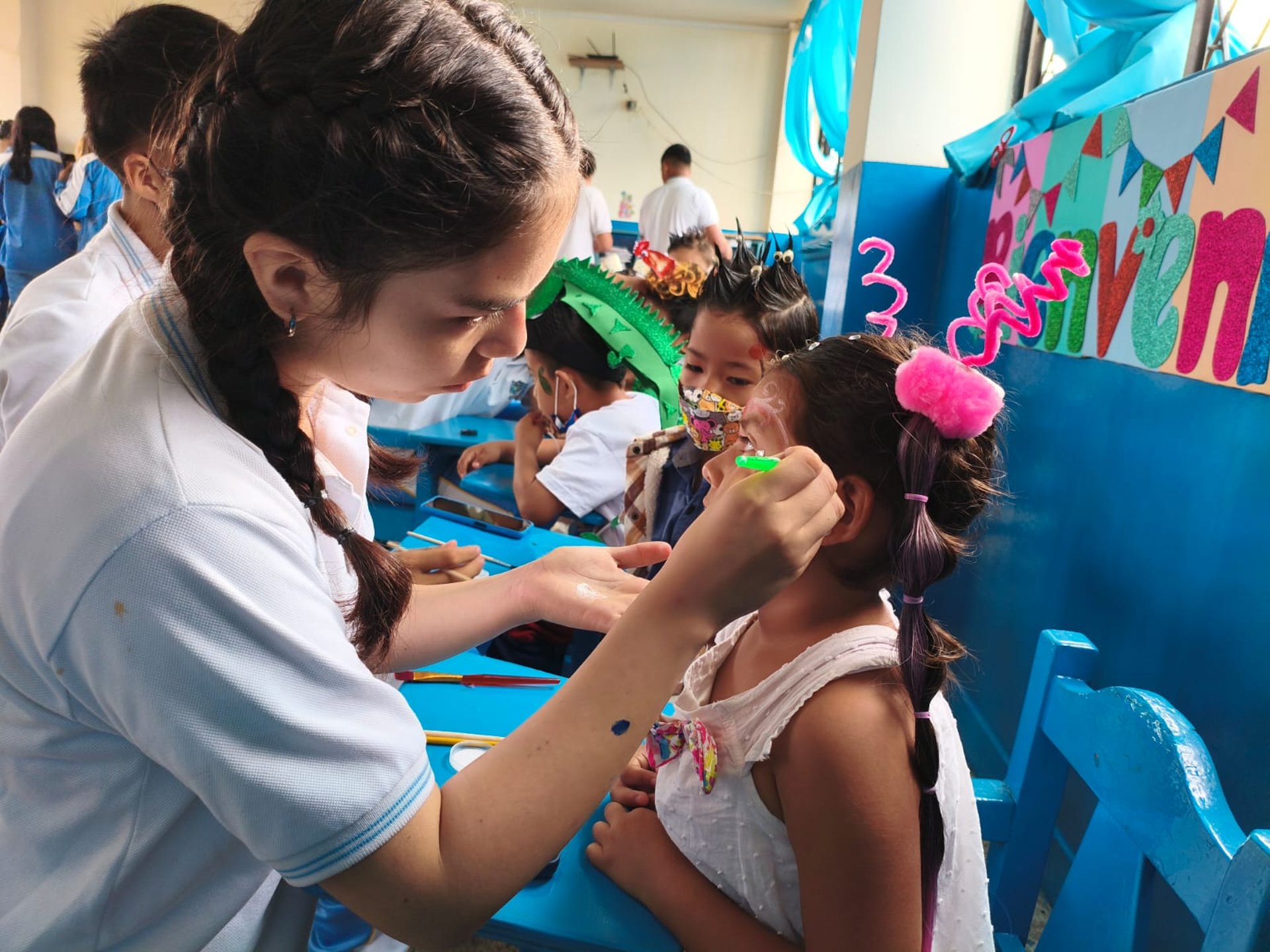 El día principal, los estudiantes mayores demostraron su gran espíritu de colaboración al pintar las caritas de los niños de la escuela, llenando el ambiente de color y sonrisas. Como cierre de la jornada, cada curso de Preparatoria, Básica Elemental y Media disfrutó de un emotivo compartir en sus aulas, al que se unieron con gran alegría los padres de familia para celebrar juntos este día tan especial.
